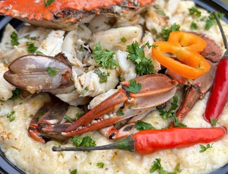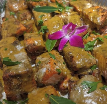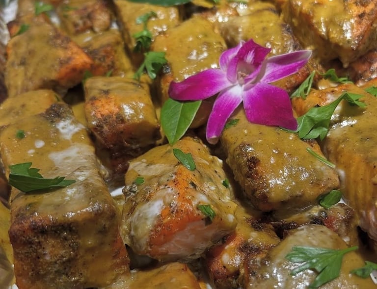 A seafood-forward menu with salmon, shrimp, crab, or specialty fish-bold spices, bright sauces, and coastal plating